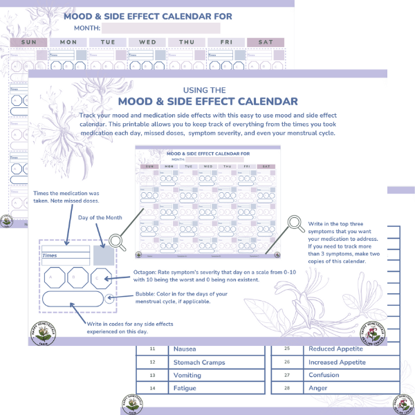 Looking to track your symptoms? Struggling with your mental health? Are you not quite sure if your medication is working or if you're experiencing side effects? This convenient and easy to use calendar allows you to track everything from your mental health symptoms, side effects, menstruation, and medication dosage times.